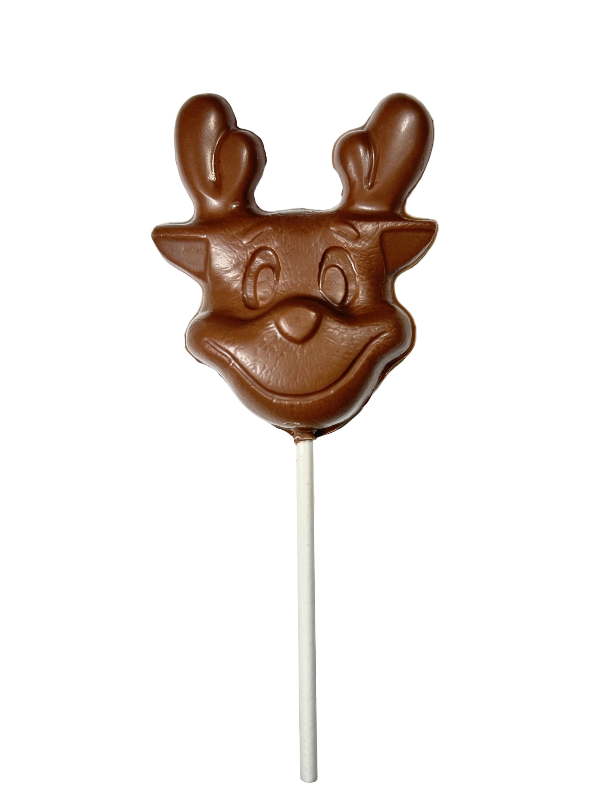 A charming reindeer-shaped milk chocolate lollipop — festive, fun, and full of holiday cheer in every creamy, chocolatey bite!