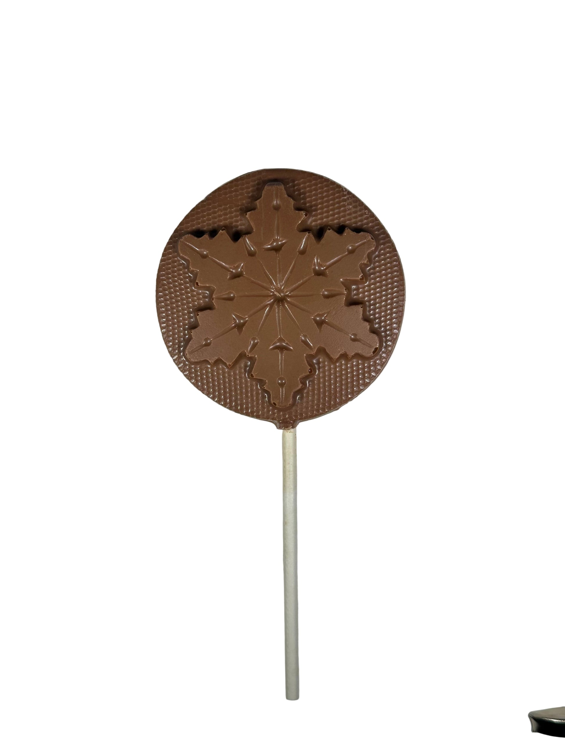 A beautifully detailed snowflake made of smooth milk chocolate on a stick — a wintery delight that’s perfect for gifting, stocking stuffers, or enjoying yourself!